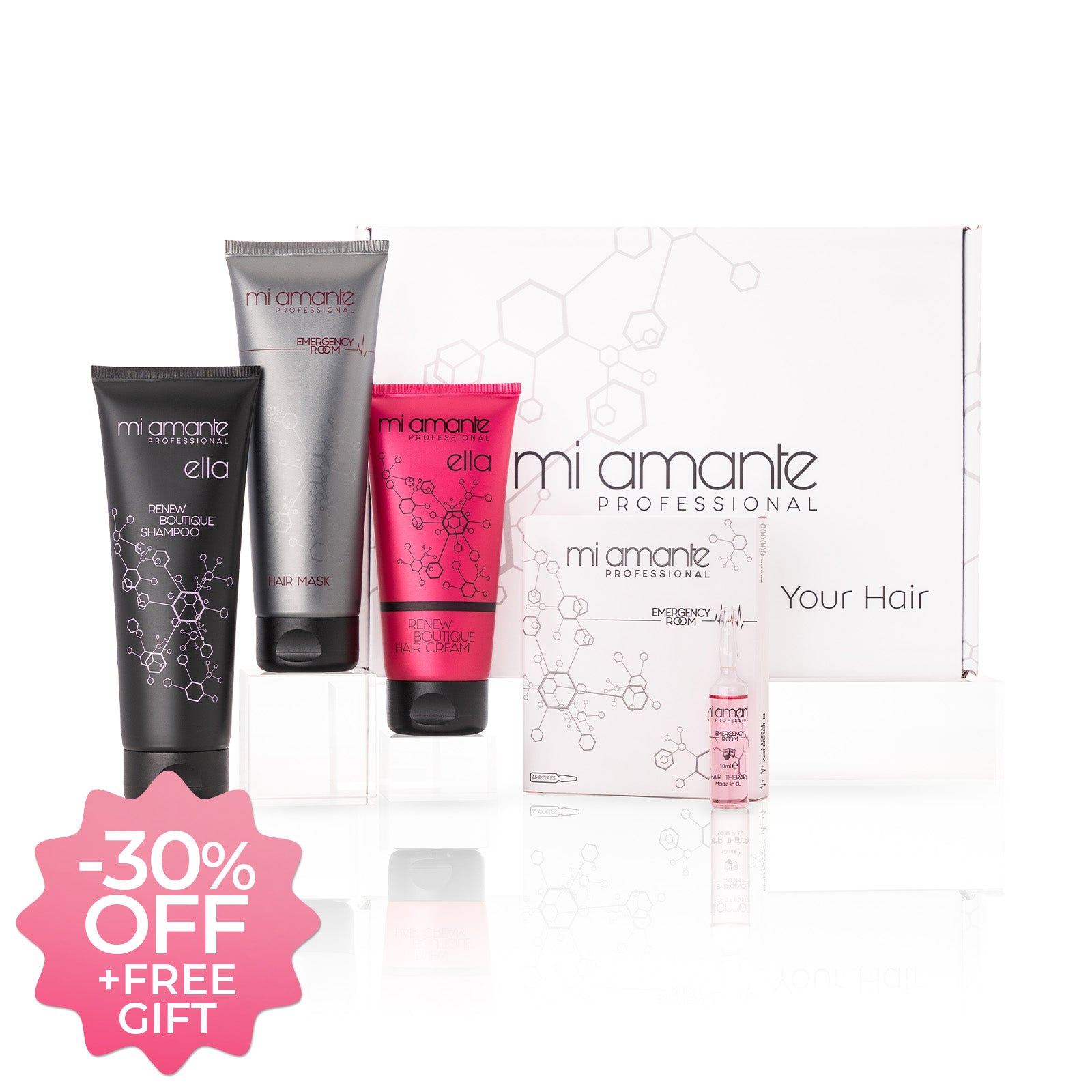 Ein komplettes Mi Amante Professional Hair Therapy, das alle Schritte zur Wiederherstellung, Stärkung und Pflege Ihres Haares umfasst.