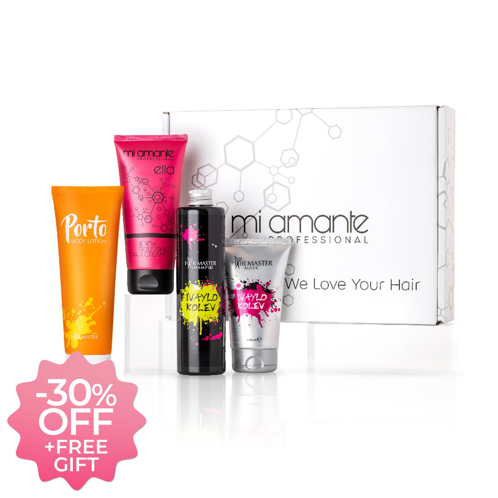 Set Ivaylo Kolev Hair Master Porto, das Hair Master Ivaylo Kolev Shampoo und Maske, Porto Body Lotion und Mi Amante Ella Haarcreme enthält.